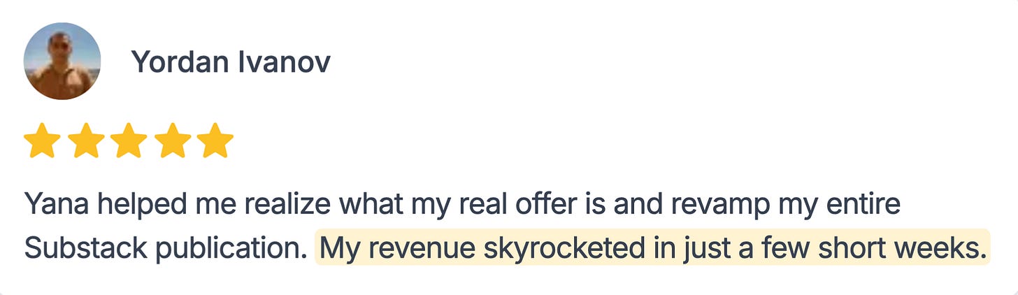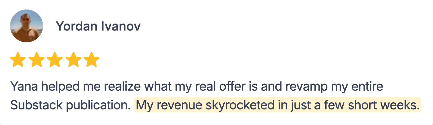 “Yana is one of the best writing and growth mindset mentors you can wish for. Since I started working with her guidance, my writing became much more specific, result driven and enjoyable. And it shows in my Substack newsletter subscribtions!”-- Daniel H. @ The Fearless YOU