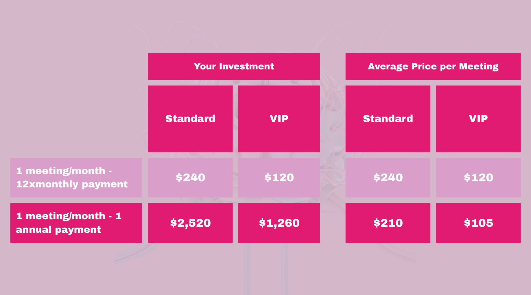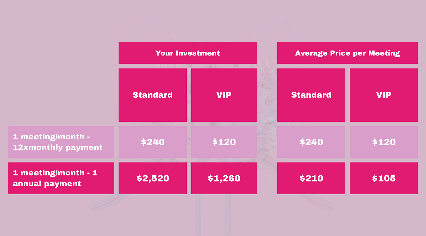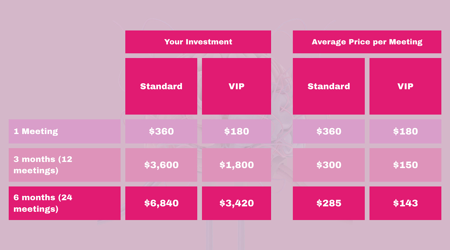 You can opt-out at any time. In case youâve paid for a package of 12 or 24 meetings and decide to opt-out, I will refund a pro-rated amount for the meetings which didnât take place. For example, if you paid $2,400 for 12 meetings and you decide to opt out after the 6th meeting, you will get a refund of $1,200, which is the pro-rated amount for the remaining 6 meetings.
