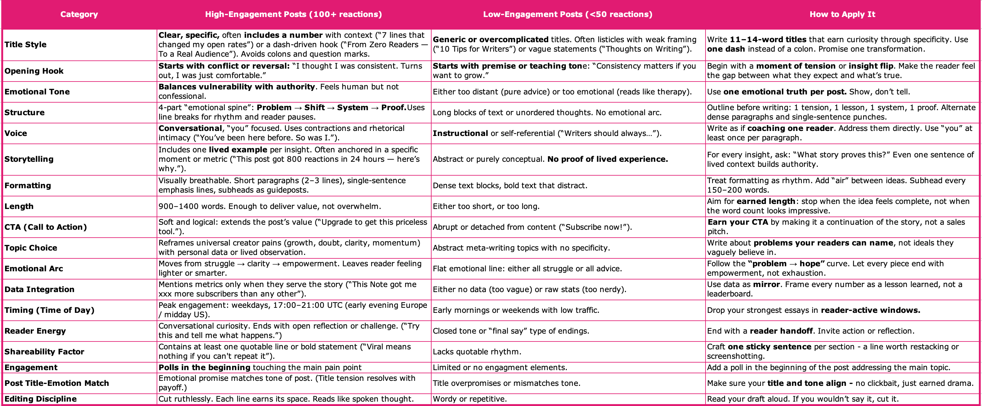 Readers love seeing creators turn their own experiments into frameworks. The “I analyzed…” format makes it educational and self-revealing. It invited readers into the process instead of teaching from above.