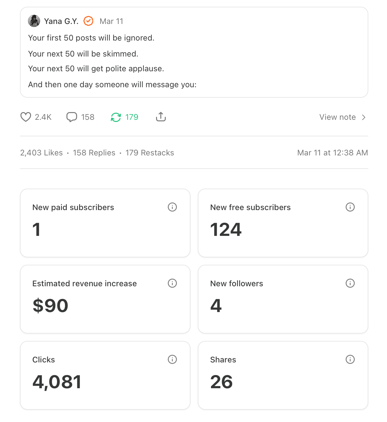 I also started working more actively on growing recommendations, as this is the other powerful growth engine (almost) no one talks about. We tend to hype over Notes, but let’s be honest: recommendations drive your growth while you sleep.
