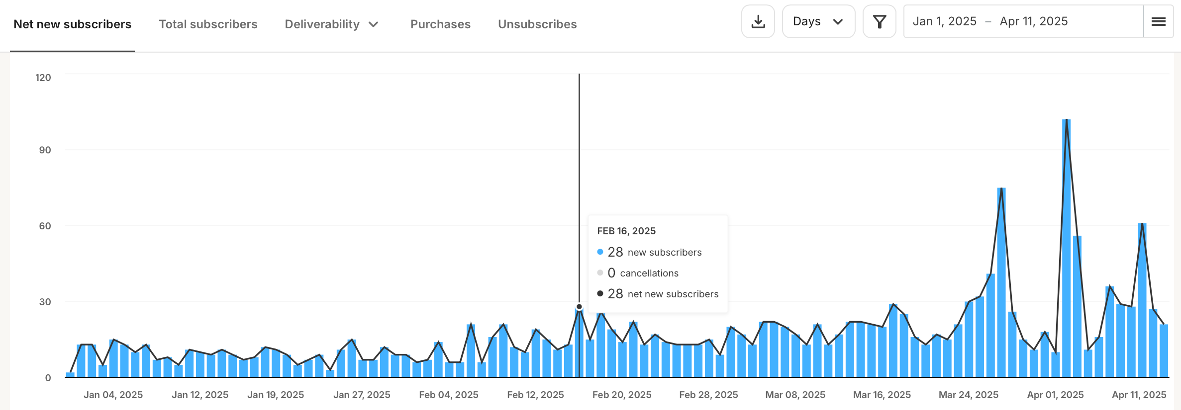 I currently gain between 20 and 50 new subscribers per day. Sometimes even 100. Here’s how my list is currently growing: