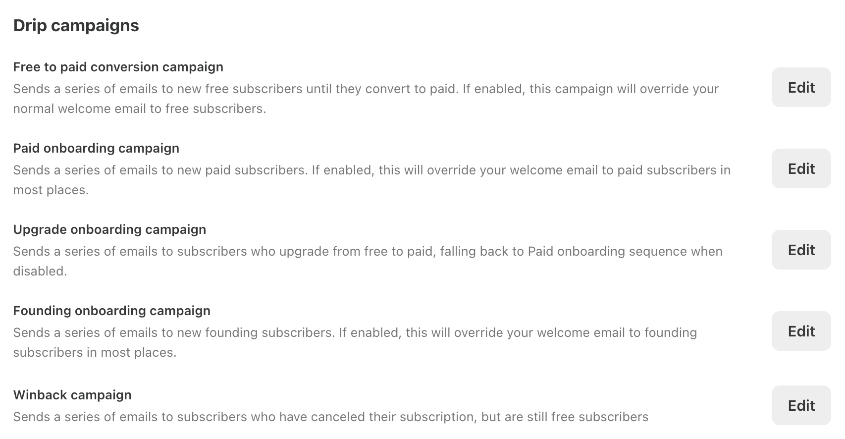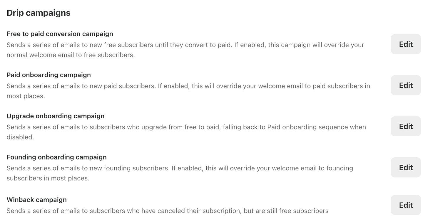 These sequences will replace the welcome emails on Substack. If you open the free→ paid conversion campaign, you’ll see it already has your welcome email there.